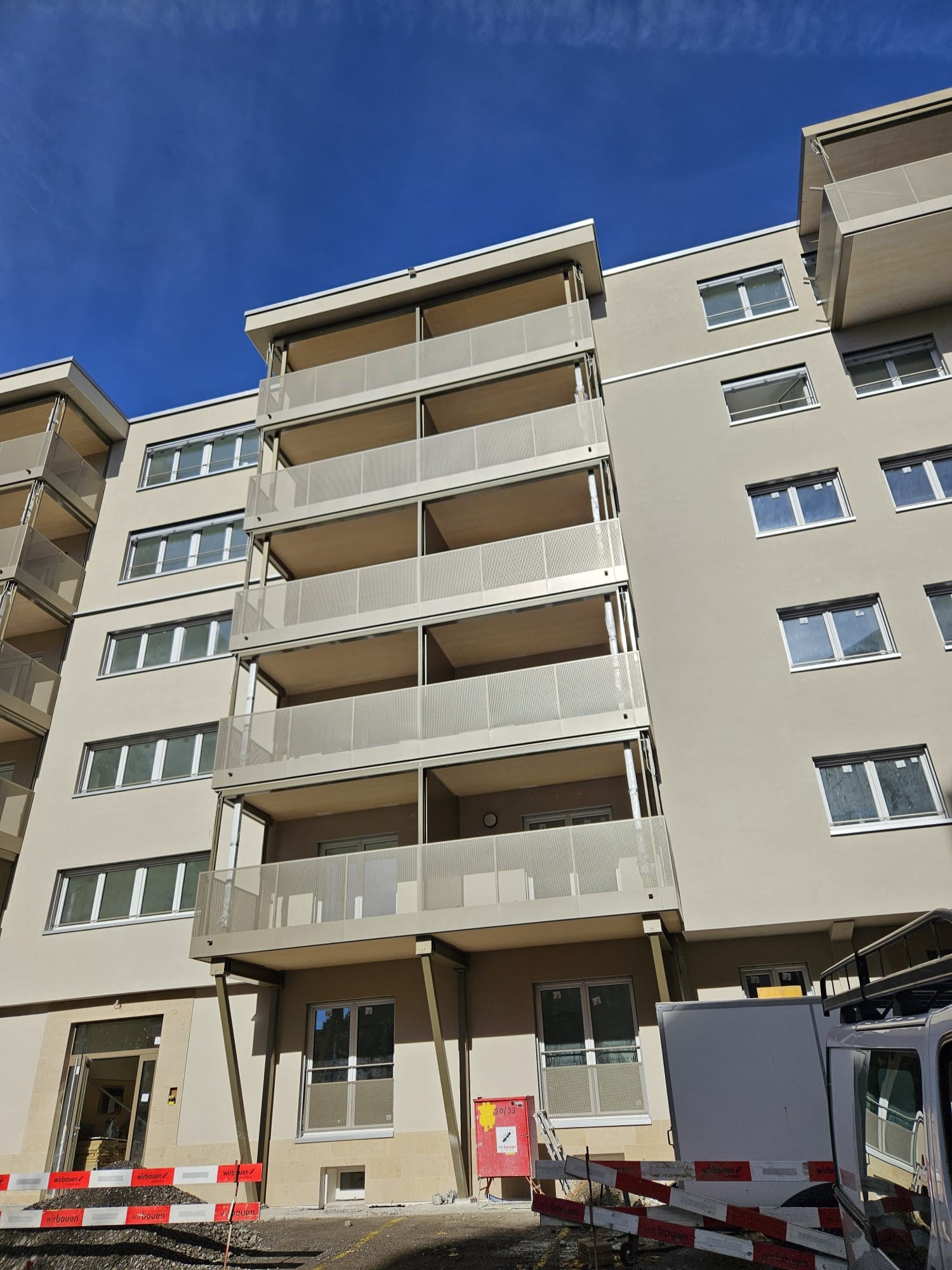 Die beiden obersten Stockwerke sind neu; es handelt sich um eine Aufstockung des Gebäudes.