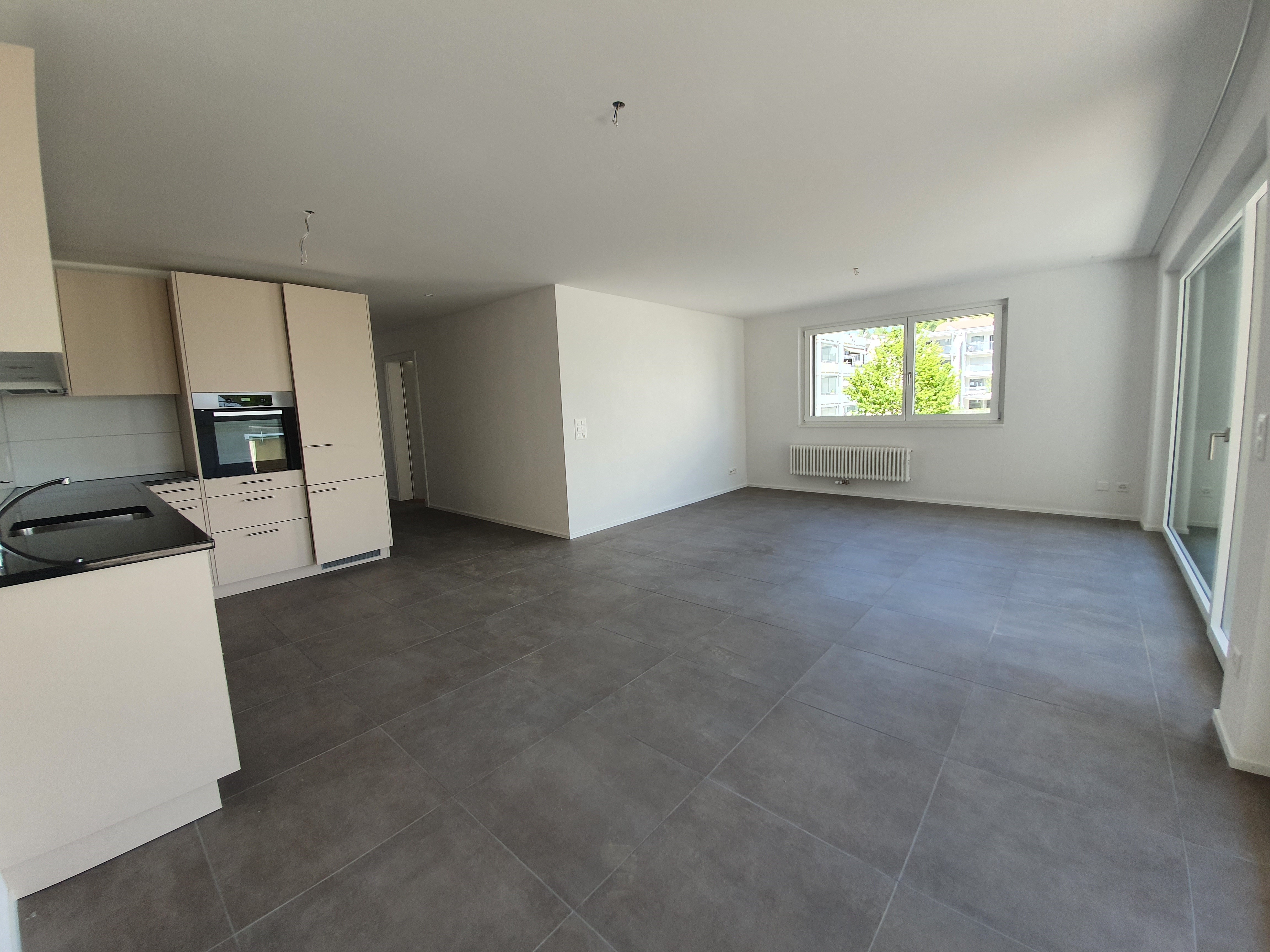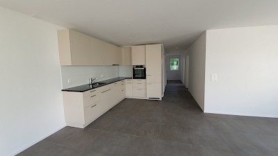 - Offene Küche mit Glaskeramikherd, Backofen, grosser Kühlschrank, Geschirrspüler