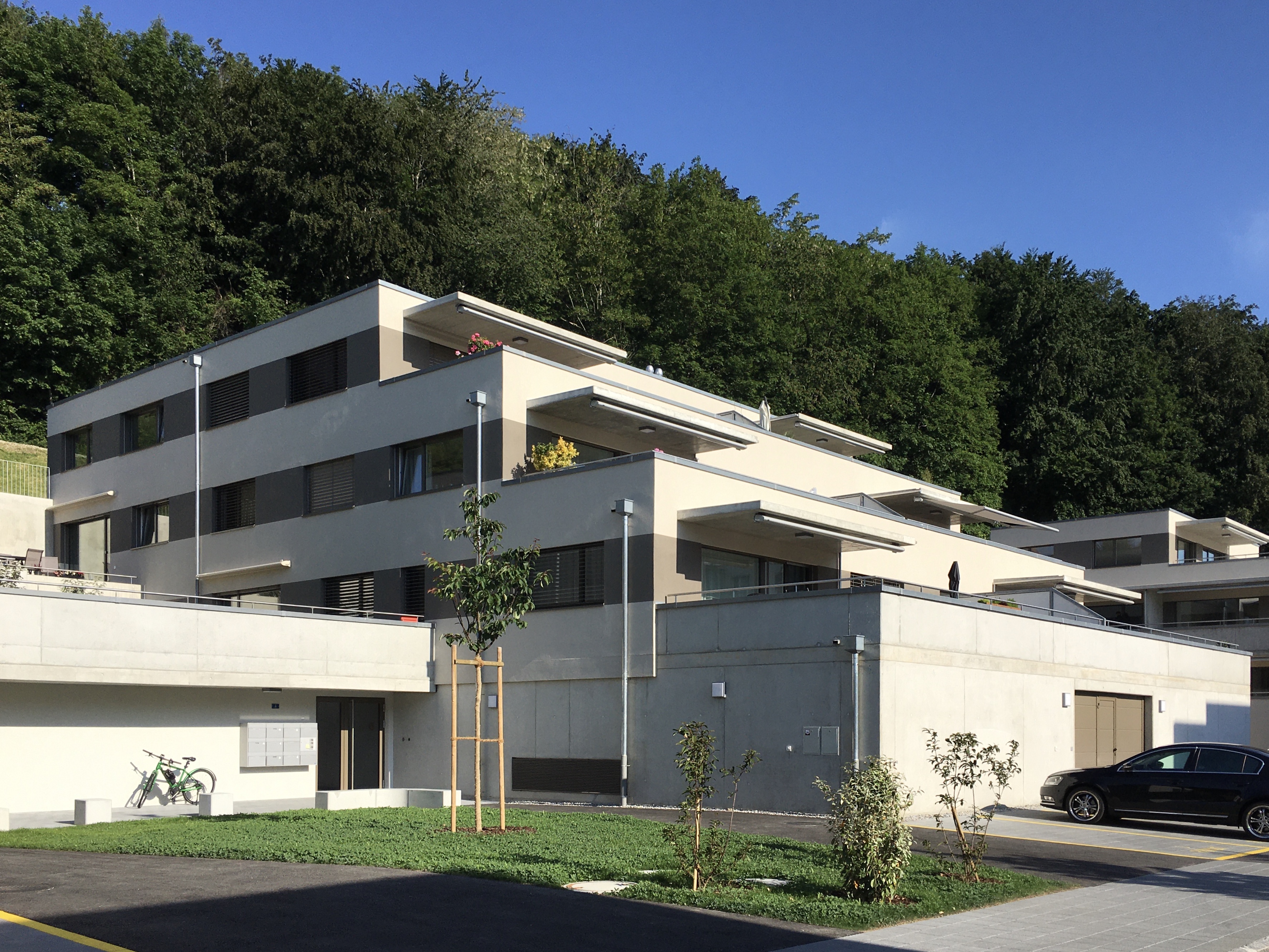 Das Gebäude steht leicht am Hang und verfügt somit über eine schöne Aussicht sowie eine optimale Besonnung. Ideale Lage mitten im Grünen in einer sehr ruhigen Gegend, wo Kinder und Familien willkommen sind.